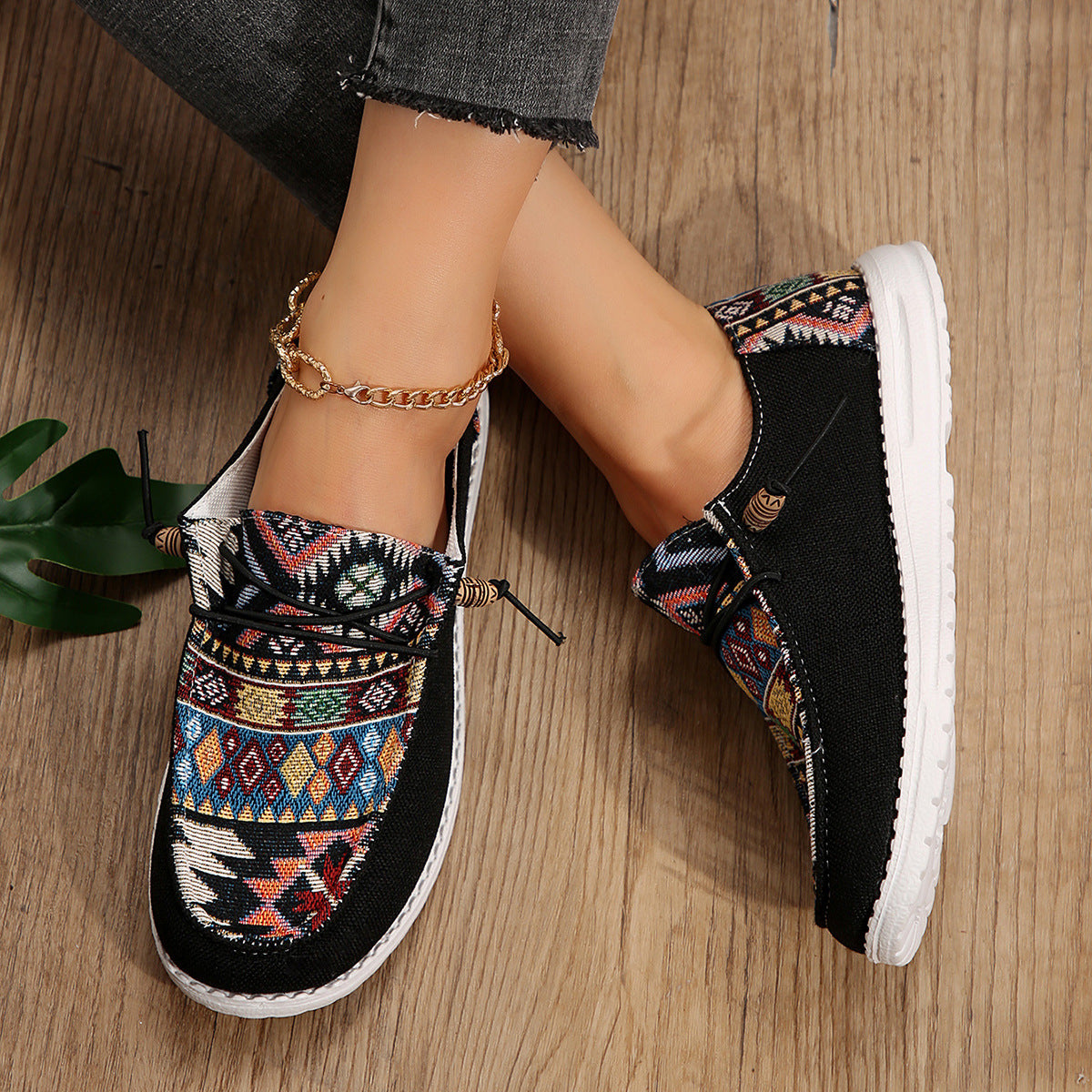 Ces chaussures femme en toile s’inspirent du style traditionnel revisité, avec des motifs ethniques colorés qui apportent une touche d’originalité et de caractère. Leur design slip-on décontracté est idéal pour un look bohème et moderne au quotidien.
